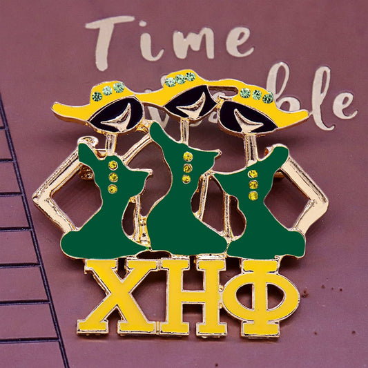 Greek XHO 1932 Fellowship Design Green and Yellow Tone Enameled Chi Eta Phi Gorgeous Lady Symbol Brooch Pin for Medical Sorority