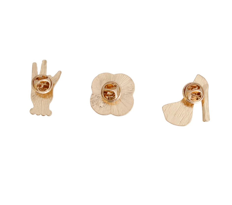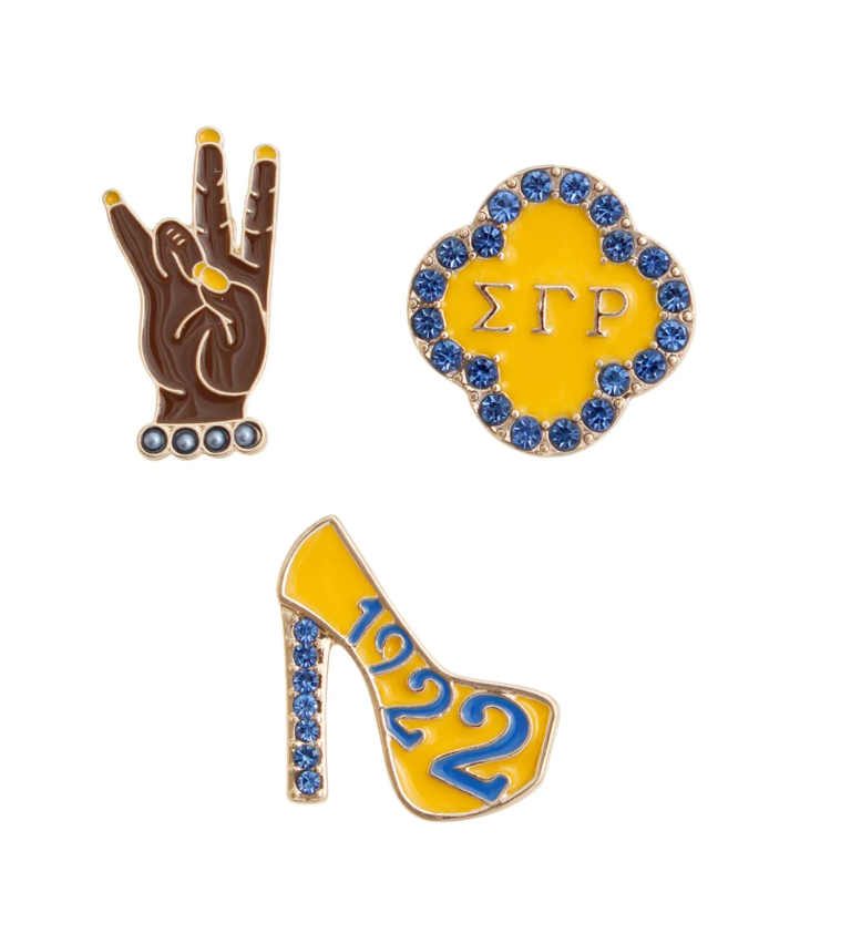 Sorority Inspired Gold, Blue and Yellow Metal with Rhinestones 3 Pcs Brooch Pins Featuring Greek Letter Flower Pin, Hand Sign Pin, and 1922 High Heel Pin. Butterfly Pin Closure. Each pin measures approx. 1 inch.