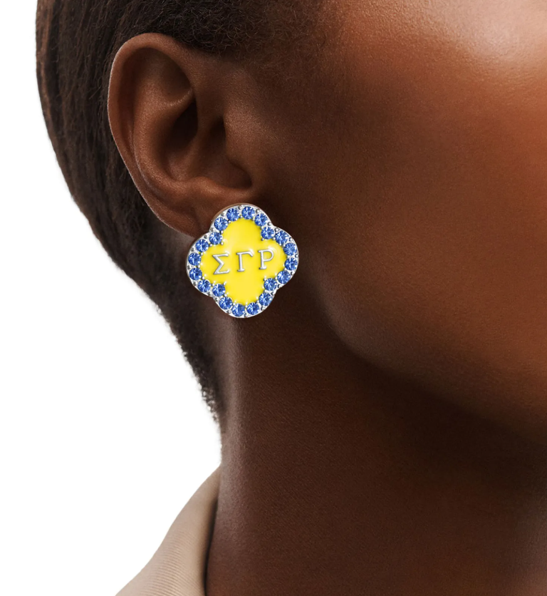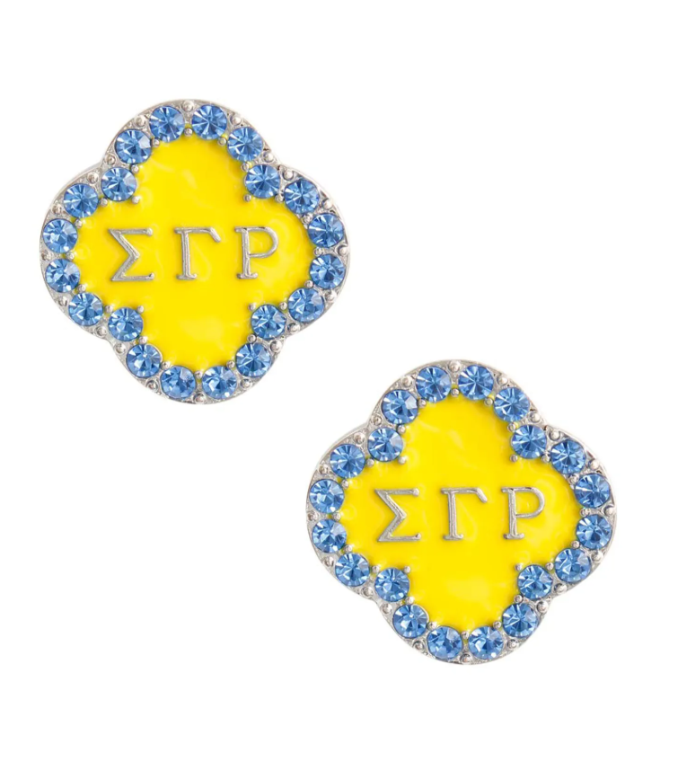 Silver Metal with Yellow Epoxy Flower Shaped Stud Earrings Featuring Sorority Inspired Greek Letters and Blue Rhinestone Detailing.
