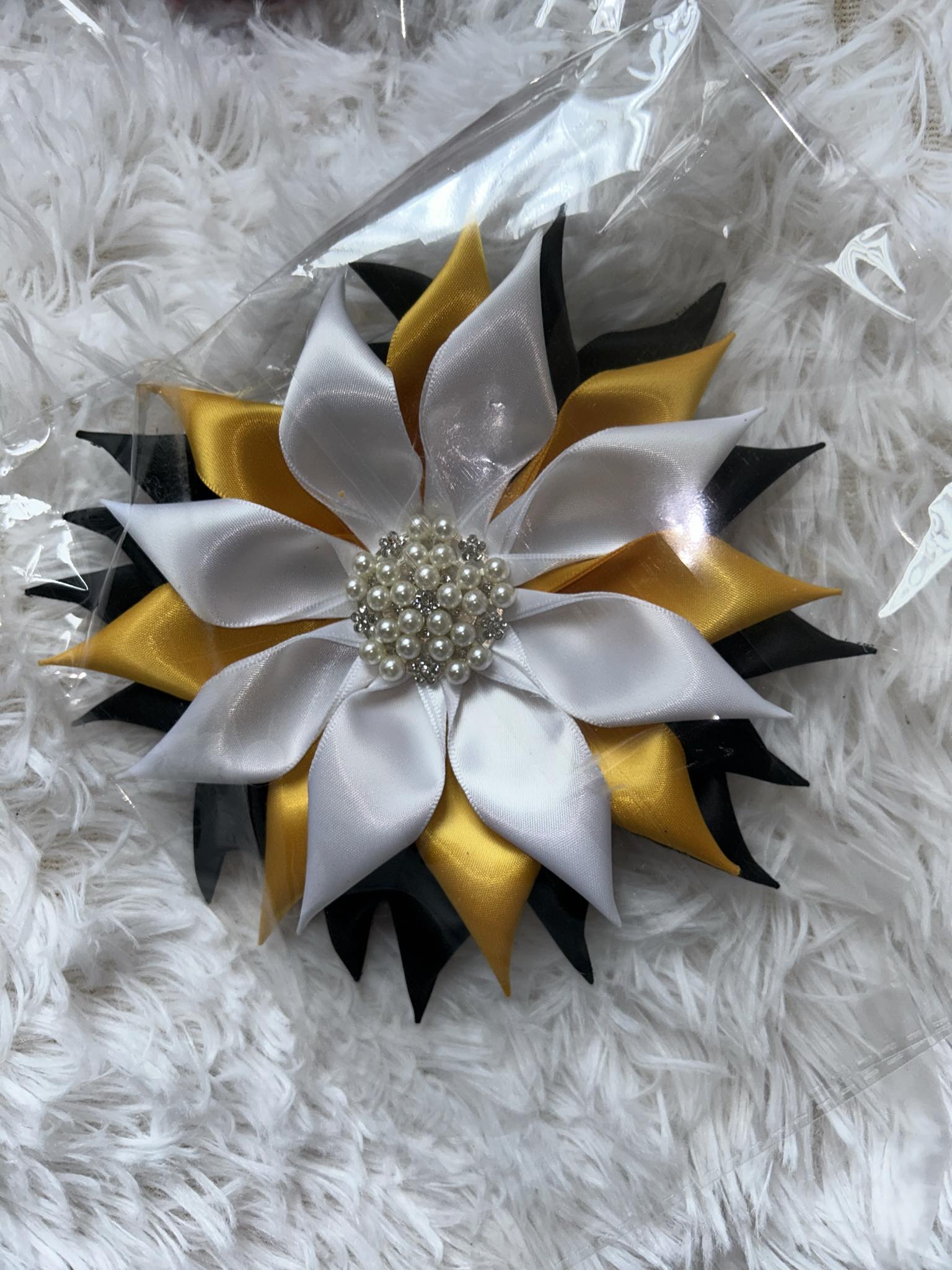 This beautiful White , Gold and Black Shoulder Brooch statement piece will attractively adorn your shoulder to complement your attire. Embellished with a clear and iridescent jeweled centerpiece set in gold. Ideal accessory item to bring life to your attire for church, weddings, receptions, banquets, gala, formal dinners, or any time you want to make a fashion statement! Attach this lovely statement piece to your garment with dual pins on the back. 11CM