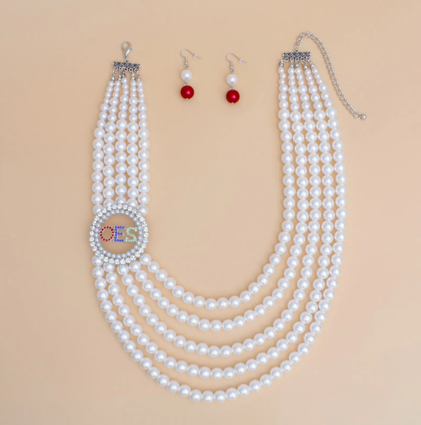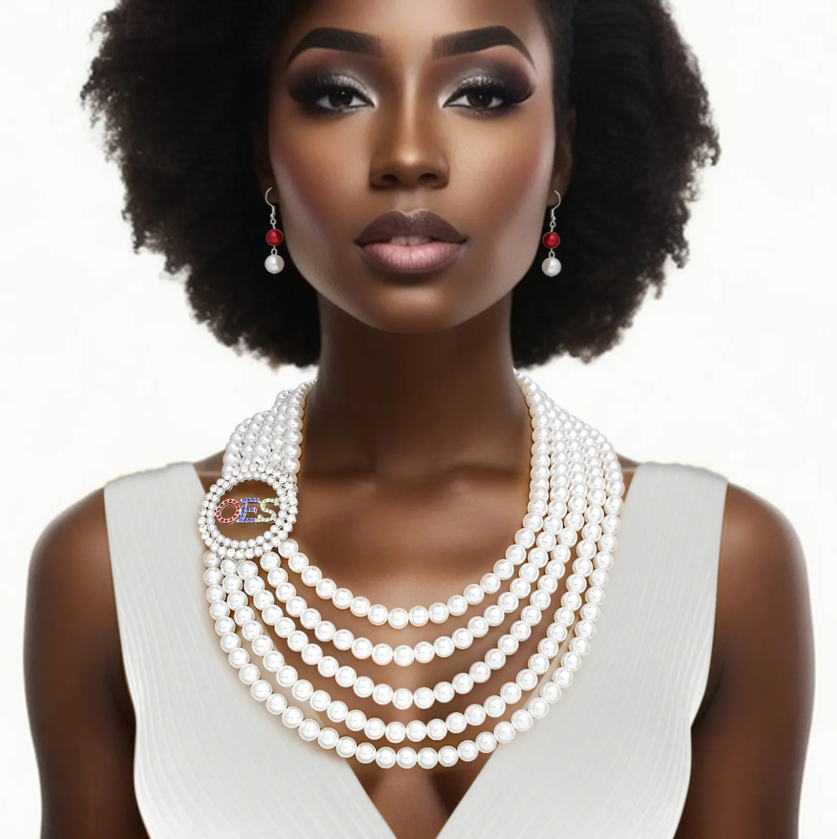 Indulge in the captivating elegance of the OES Sorority White Pearl Necklace Set, crafted for the woman who wears her pride with grace and sophistication. This striking piece features five strands of luminous white pearls, artfully layered for a look that's both grand and graceful. At its heart lies a dazzling OES centerpiece, framed by clear rhinestones and silver metal, exuding heritage and style. Paired with matching double-drop pearl earrings, this set is a radiant homage to the Order of the Eastern Star.