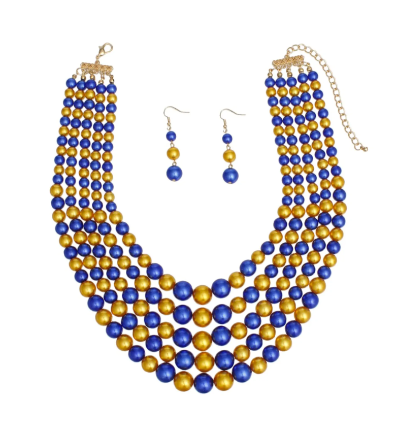 Step into the spotlight with the SGRHO Alternating Blue Gold Pearl 5 Strand Set-where elegance meets empowerment! This stunning necklace set features alternating blue and gold acrylic pearls arranged in a luxurious five-strand graduated design. Measuring approximately 3 inches wide, this piece adds an exquisite touch to any outfit, whether you're celebrating sisterhood or making a statement at a gala. Paired with matching triple pearl drop fish hook earrings, this set is your go-to accessory for flaunting your SGRHO pride with flair!