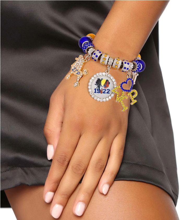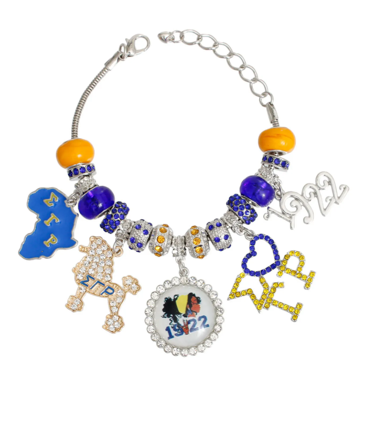 Step into your sparkle and rep your royalty with the Royal Legacy SGRHO Charm Bracelet — a statement piece designed to shine just like the women of Sigma Gamma Rho. This silver-tone snake chain bracelet features dazzling gold and blue glass rondelle beads, rhinestone accents, and an empowering lineup of epoxy and rhinestone SGRHO charms. From the graceful poodle to the proud African continent, Greek letters, and “1922” heritage icons, this bracelet is more than a look — it’s a legacy. Finished with a lobster clasp for secure wear, it’s perfect for repping your sisterhood with pride, power, and a whole lot of glam.