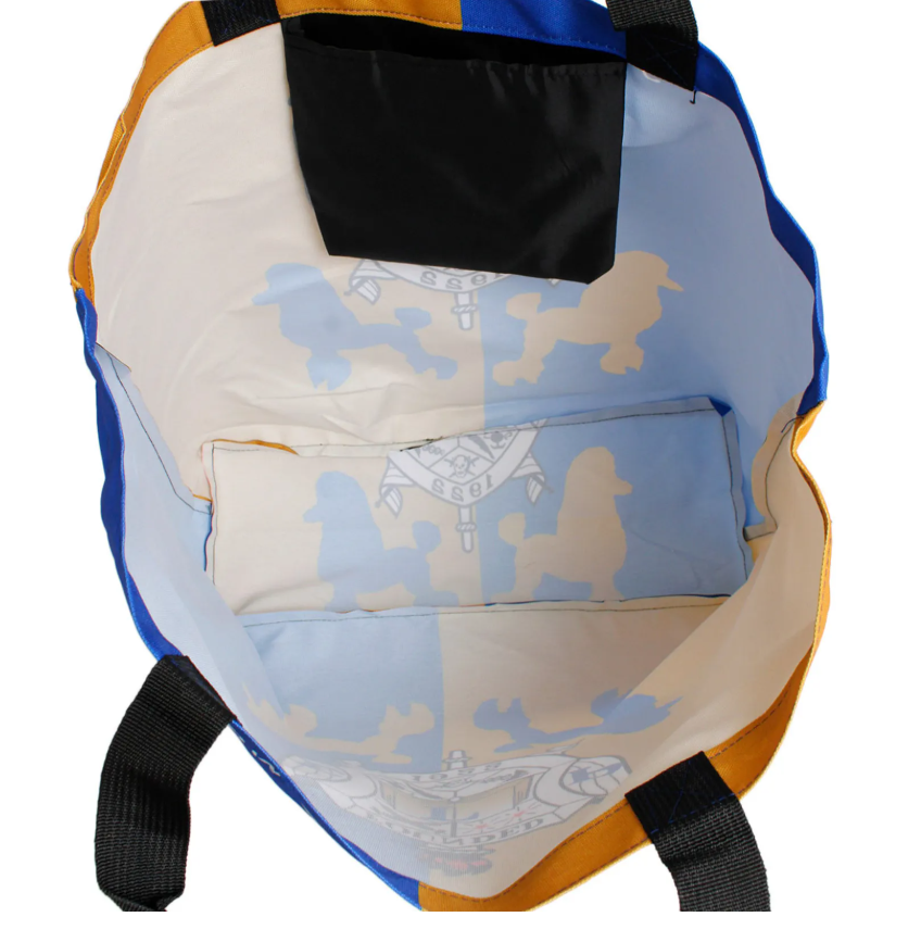 - Bold Colorblock Design: Eye-catching gold and blue canvas tote with vibrant SGRHO shield and poodle graphic print.
