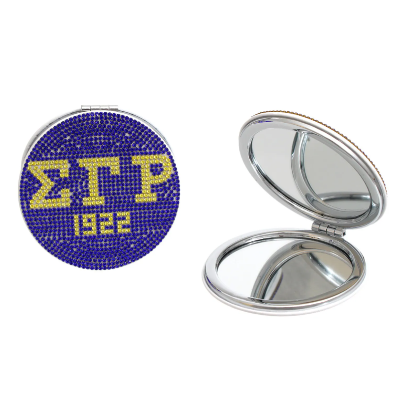 Elevate your elegance with the SGR Sorority Blue and Gold Bling Mirror Compact. Because every Sigma Gamma Rho woman deserves to sparkle with sophistication, wherever she goes.