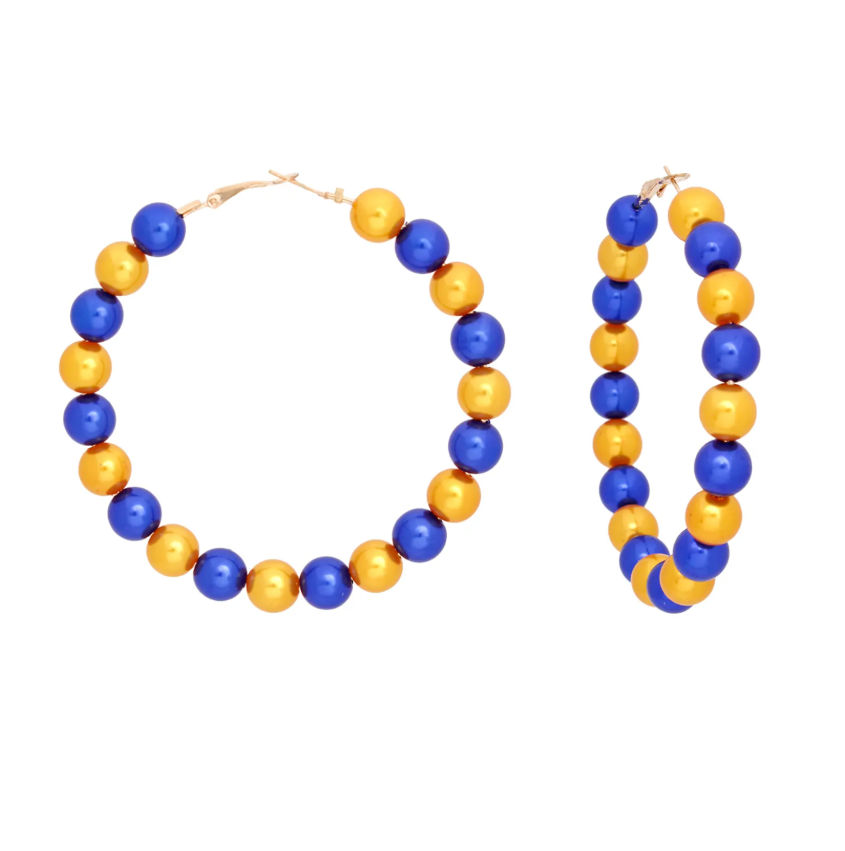 Embrace the elegance of Sigma Gamma Rho with our Wholesale SGRHO Sorority Blue Gold Pearl Hoops for Women. These exquisite hoop earrings feature gold metal wire hoops adorned with alternating acrylic blue and gold pearls, perfectly capturing the sorority's regal colors. The saddleback closure provides a secure and comfortable fit, making these hoops a stylish and practical addition to your accessory collection. Whether you're attending a sorority event or looking to add a touch of sophistication to your everyday attire, these hoops are the epitome of chic.