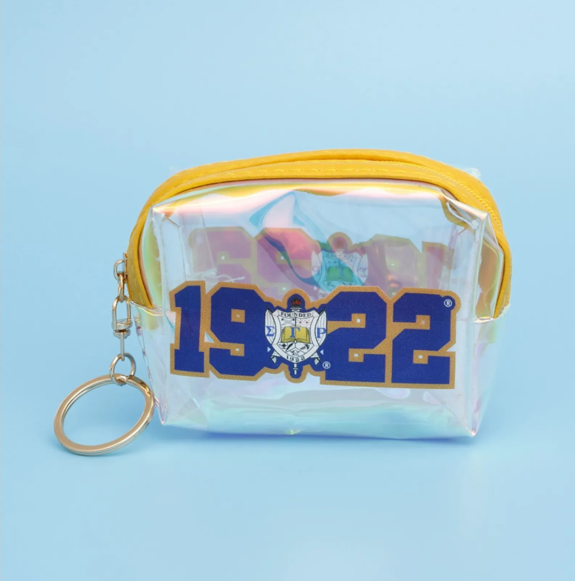 Introducing the ultimate blend of sass and functionality-the SGRHO Iridescent Zipper Pouch Keychain! This dazzling accessory isn't just a pretty face; it's designed for the fabulous woman who knows how to flaunt her Sigma Gamma Rho pride in style. Crafted from iridescent clear PVC with a striking yellow trim, this squared pouch features the iconic blue and gold SGRHO 1922 and shield graphic print on both sides. Perfectly sized for your AirPods and ready to dazzle from your handbag or as a keychain, it's a must-have for every member of the sisterhood!