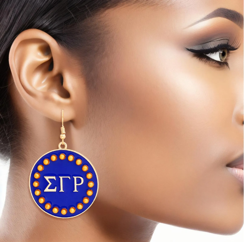 | Tags | Women's Fish Hook Earrings, Metal Composite Electroplated with Nickel and Cadmium Free Alloys Circle Drop Detail, Sigma Gamma Rho Sorority Paraphernalia, Blue Epoxy, Gold Pearl Stud, SGRHO Greek Letters |