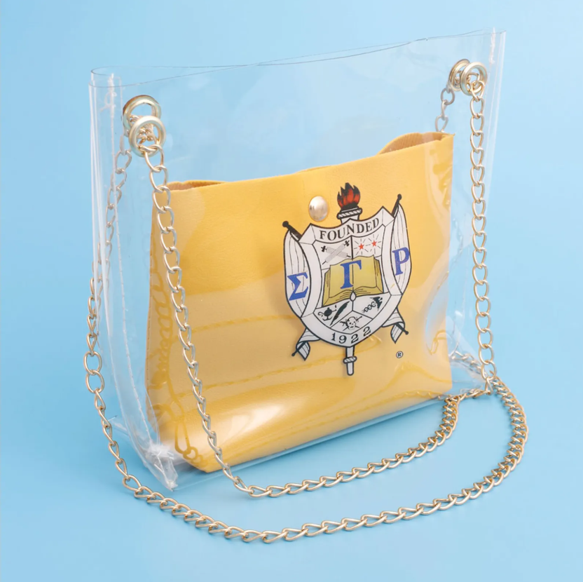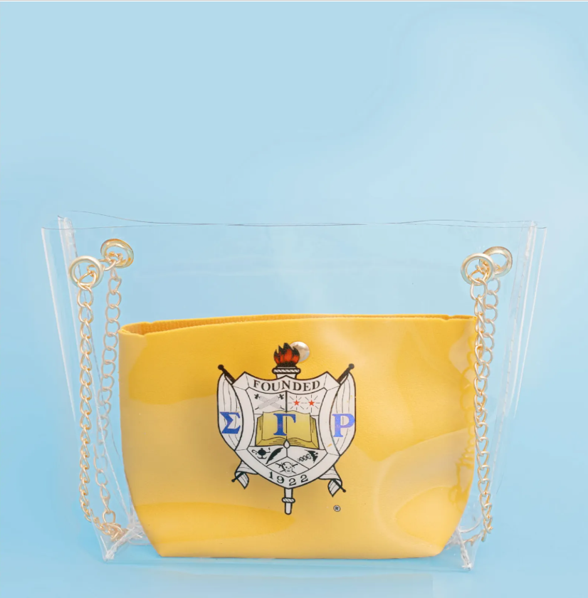 | Tags | Women's, Bag, Small Shoulder Bag, Sigma Gamma Rho Sorority, Clear PVC, Gold Metal, Shoulder Chain Bag, Yellow Vegan Leather, Snap Pouch, University |