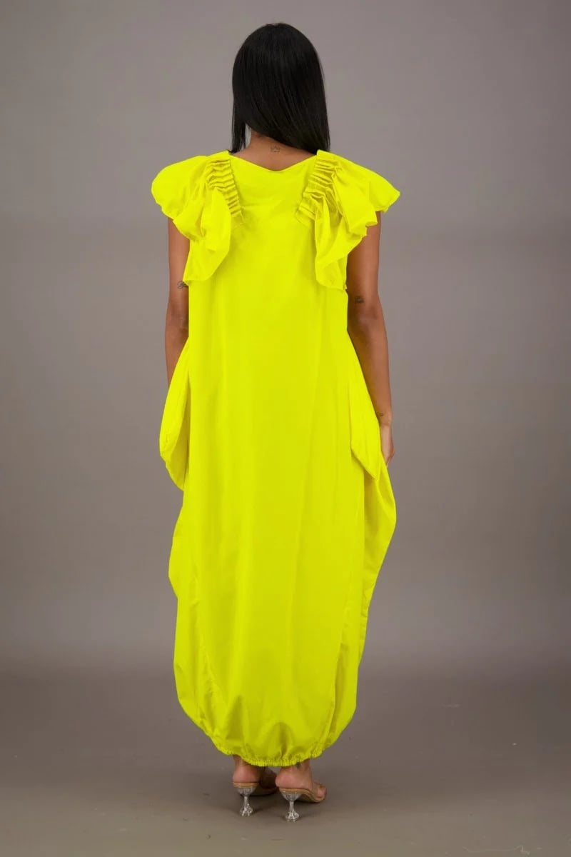 The Flowing Grace Bubble Dress is a celebration of effortless elegance. Designed for comfort and versatility, this dress features a voluminous bubble hem that moves beautifully with every step. The structured ruffle sleeves add a touch of refinement, while the two deep pockets offer practicality without compromising style. With its relaxed fit and graceful drape, this dress is perfect for any occasion—whether you're dressing up or keeping it casual.